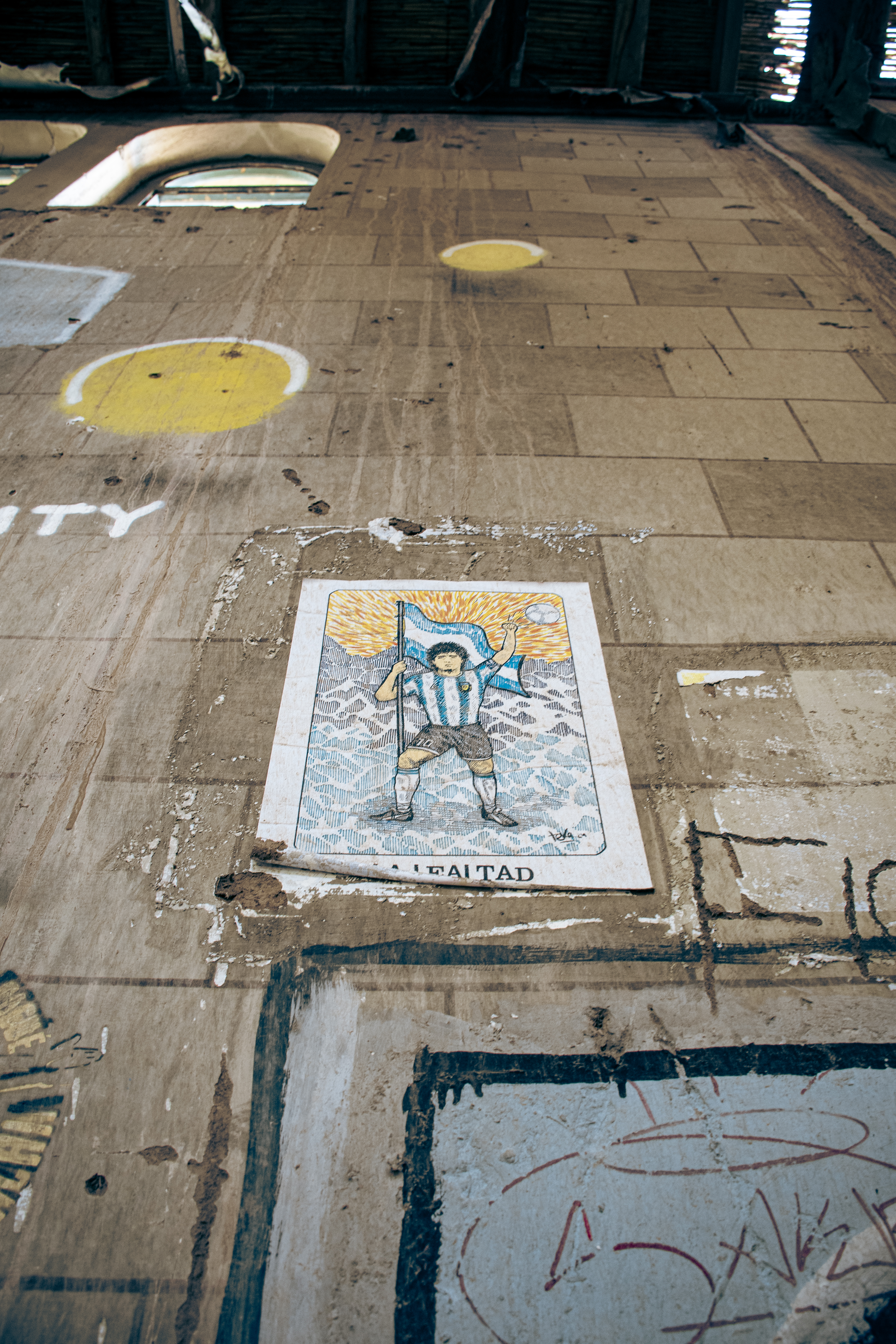 Antes de salir, algo me llamó la atención: una especie de póster chiquito, pegado en una pared, bastante más alto que la línea de los ojos. Tenía estética de tarot. Se veía el Diego con la bandera argentina y, donde debería decir el nombre de la carta, decía: